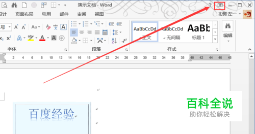 找到Word主界面右上角如图位置按钮“功能区显示按钮”。