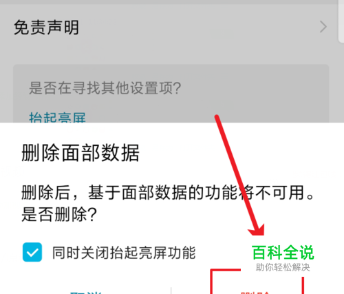 点击后,下方会弹出提醒窗口,提醒我们删除面部数据后无法使用人脸解锁,我们点击下方的删除,即可关闭人脸解锁功能。