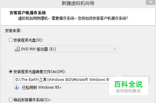 实际上,如果使用Windows 95的ISO镜像,会出现错误。因为95还无法自动识别ISO。因此,如果需要安装,首先要使用MS-DOS的光盘对系统进行分区。然后才可以使用手动引导安装95 ISO。(即使用MS-DOS安装程序中的创建分区功能,在系列1中有介绍。)所以说先选择MS-DOS的镜像来进行引导(图片中示意错误,请忽略)