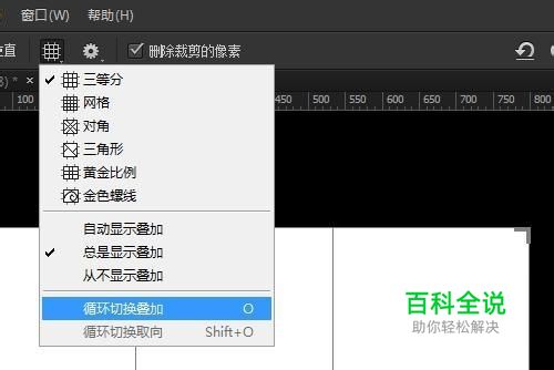 当然要切换其他叠加方式,可以直接在选项栏选择,其实还有快捷键,我们点击画布显示出叠加,再看递加选项下面循环切换叠加(快捷键O)和循环切换取向(快捷键Shift + O)后面都有快捷键了。