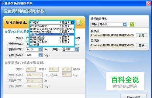 选择导出的视频格式。 随后,我们会进入到“设置待转换的视频参数”对话框,我们可以将导出格式选择为“FLV格式”。其中,软件支持两种FLV格式,一种是普通FLV格式,一种是高清FLV格式,普通FLV格式采用H263编码,高清FLV采用最新的H264编码,又叫F4V。我们根据自身需要进行选择即可。