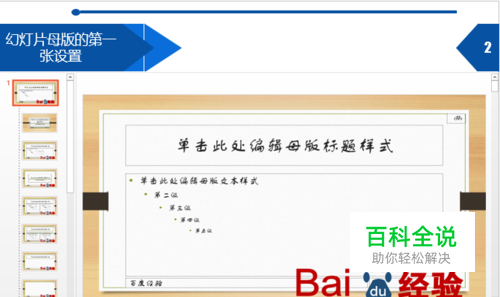 3.幻灯片母版的第二张设置 如图,在幻灯片母版的第二张设置,会发现在普通幻灯片视图中只有第一张幻灯片有logo,效果如下图。