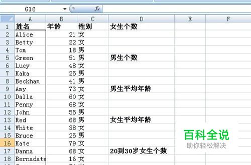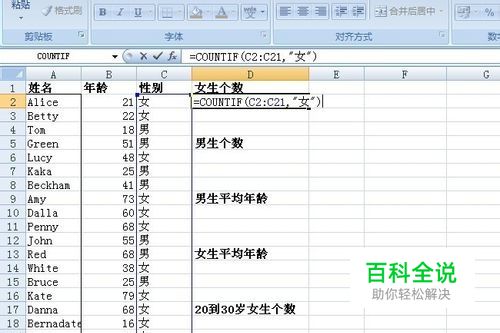 一:计算女生个数 将光标移动到D2单元格中,输入函数公司=COUNTIF(C2:C21,"女"),如下图所示。按Enter键即得出结果。结果如下图2所示。