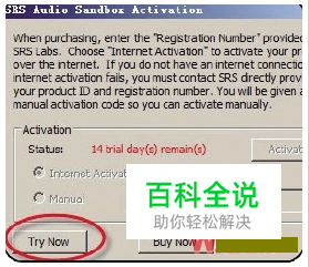 2、使用SRS Audio Sandbox改善音质 下载安装SRSAudio Sandbox工具,运行软件如果有注册码请输入注册码并点击“activate”激活,如果没有注册码点击“Try Now”试用。网上有这个软件的注册机和汉化版,如果需要的话可以自行下载。