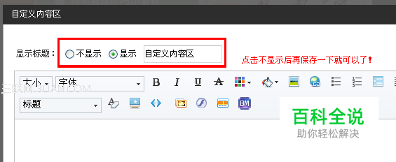 如何隐藏自定义内容区模块的标题?有很多新手店长因为在自定义内容区的模块中安装了模版代码后,发现自定义内容区的标题一直显示,影响店铺美观。但又不知道怎么隐藏这个标题!其实很简单的,只需要大家进去自定义内容区模块的编辑器!然后按照下面的图示来操作后,点击保存和发布就可以了!