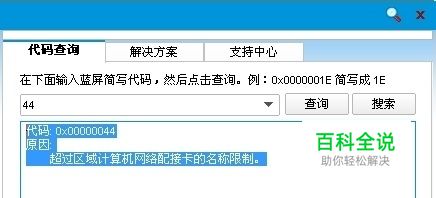 经查蓝屏查询器,这个44蓝屏错误代码的缘由是: 代码: 0x00000044原因: 超过区域计算机网络配接卡的名称限制。