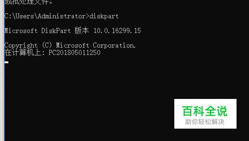 在弹出框中输入命令diskpart,作用是显示Diskpart 版本及当前计算机名称。如图