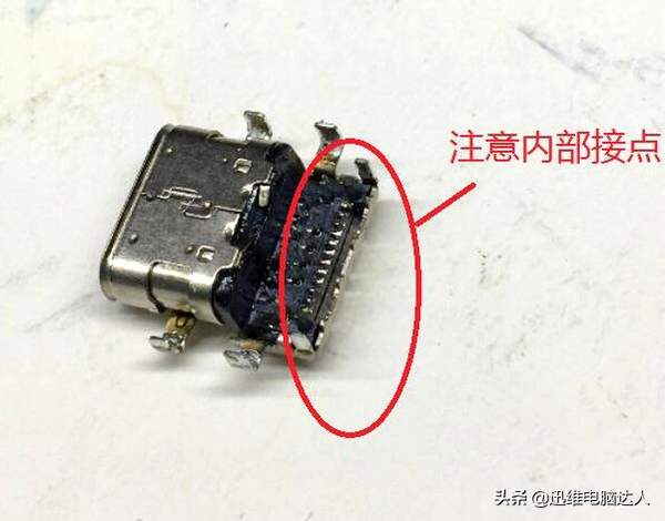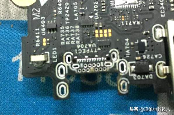 从上图中大家可以看到TYPE-C口的焊点,除了插入孔问题还有贴着的触点,而贴着的触点是在铁壳内部的,无法用烙铁焊接。以后大部份机器为了节省成本,或许也都会采用这种接口设计。