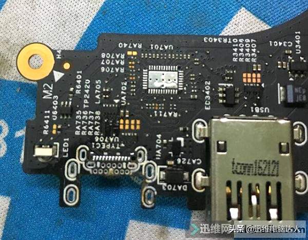 首先拆下UA701,再量UA702短路的两组数据线,发现一组不短了,一组阻值15左右,还是有短路,仔细查看发现充电口有烧焦变形,果断拆下充电口,再量UA702,UA706各组数据线,没有短路了,看来是坏了一个TYPE-C接口,一个TYPE-C芯片。