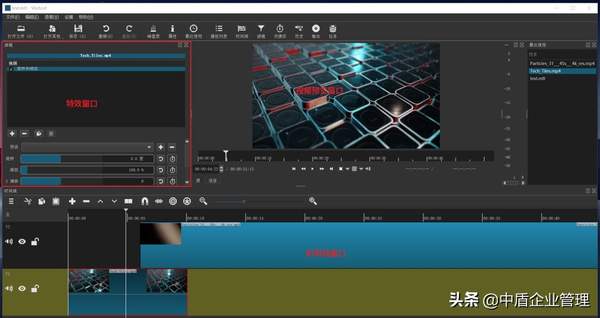 左上角的特效窗口,可以为视频或音频素材添加各种特效,如高斯模糊、降噪等,且为对象的位置、缩放或旋转等参数添加关键帧来制作动画。