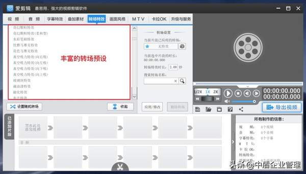 快剪辑虽然导出的视频没有水印,但它也存在一些不足,相比爱剪辑,它的转场效果比较少。