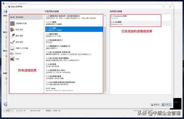 打开的过滤器面板中,左侧是软件内置的所有滤镜效果,双击任意一个效果,就可以将效果添加到视频上,右侧的选用的过滤器则可以看到添加的所有效果。
