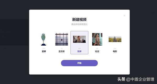 当你新建一个剪辑工程时,软件提供了5种视频尺寸,比较常用的有9:16(竖屏)和16:9(宽屏)两种尺寸。
