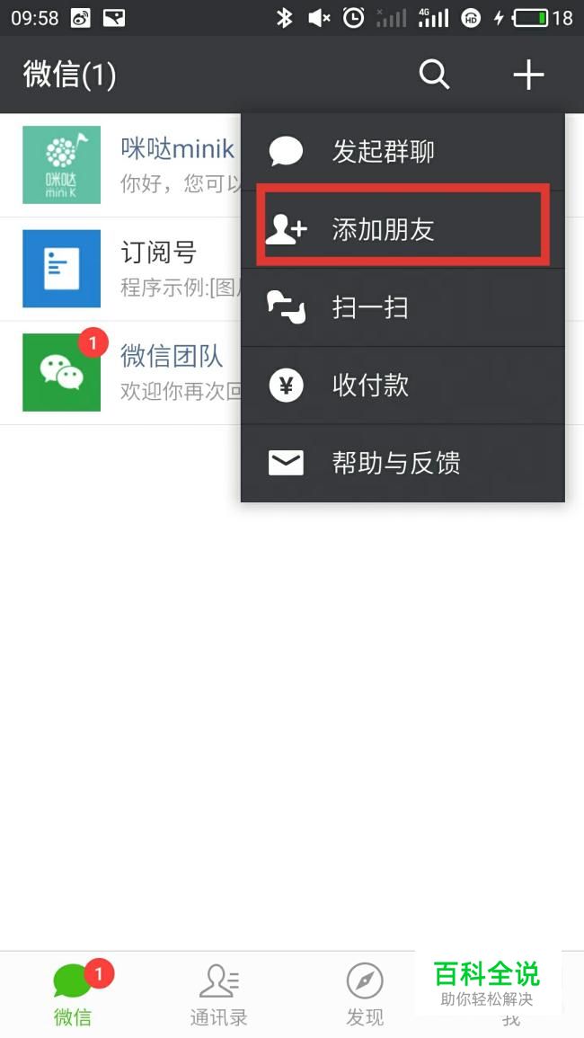 点击右上角的添加按钮,添加朋友。选择公众账号添加