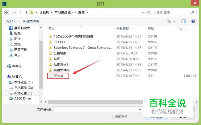 在该界面内按下键盘上的才让他来+O键,弹出打开对话框,在该对话框找到我们的psd格式的文件,如图所示: