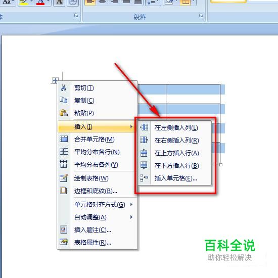 然后,我们全选中表格,单击鼠标右键,选择“插入”,在这里有很多种插入方式。比如可以在左侧或者右侧插入列,在上方或者下方插入行。