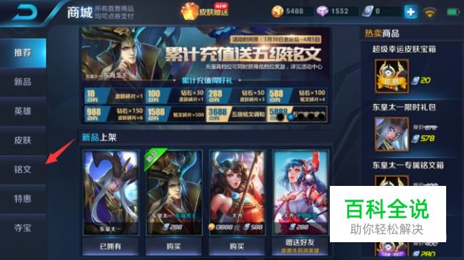 在手机中打开王者荣耀,登陆自己选择的区。在首页中找到商城,在左边的分类中找到铭文这一项点击进入。