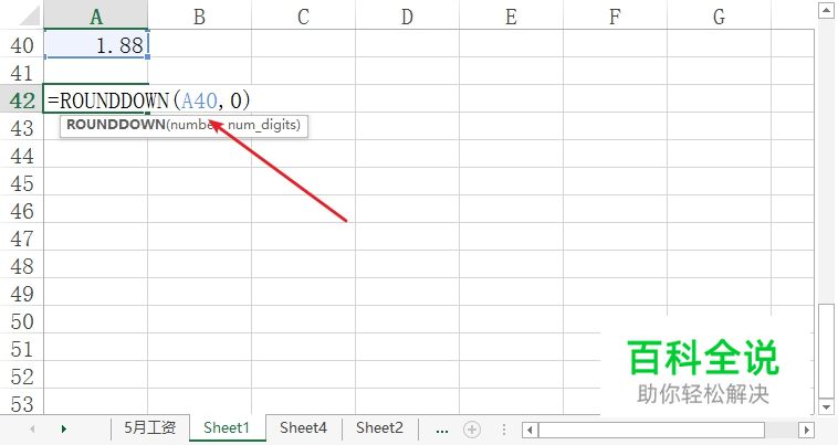 在A42单元格内输入函数公式“=rounddown(A40,1)”,rounddown是向下取整函数。