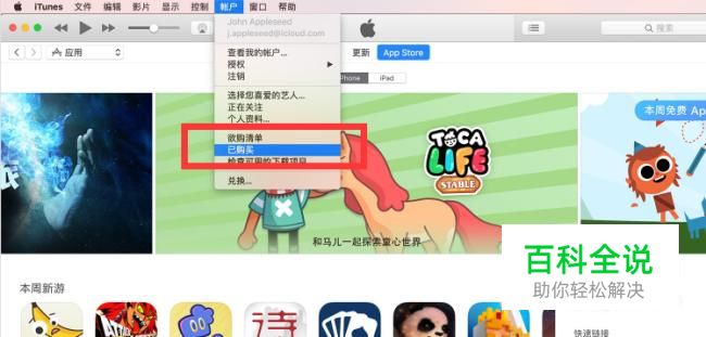 之后登陆apple id。再点击软件上方的“账户”,选中“已购买”。