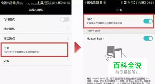 开启手机NFC功能,同时确定手机NFC位置。前者一般是在“系统设置”里的“无线和网络”栏可以找到,可是不同的手机具体情况会不一样,详细自己可以查阅一下手机说明书,里面也会提到手机NFC的具体位置的。