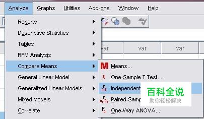 依次选择analyze,compare means,independen-samples T test