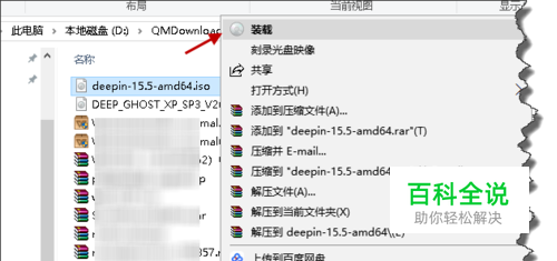 Win10的该文件夹中,右键点击ISO镜像文件,可以看到在弹出的右键菜单中,有一项“装载”项。如下图: