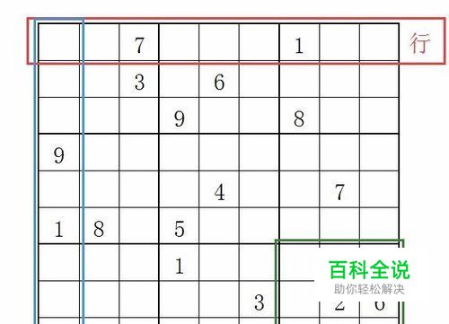 数字排除。 如图: 1、这个宫(绿色位置)只余下上面一行没有填,从“宫”中已有的数字可以得出这三个格分别应该填上2、3、6 2、G4(黄色位置)可以用数字排除得出结果,根据G4对应的行、列、宫(蓝色位置)已有的数字,从1-9开始数起,在行、列、宫各自不重复的情况下,得出G4是它们缺少的5