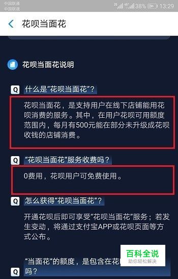 第一步我们首先需要知道花呗当面花是指用户在线下店铺可以用花呗消费的服务,而这些店铺没有开通花呗收钱服务,每月可以有500元额度,如下图所示: