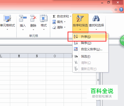 然后对我们输入的原始数据进行排序。点击右边的【排序和筛选】,在下拉菜单中选择【升序】