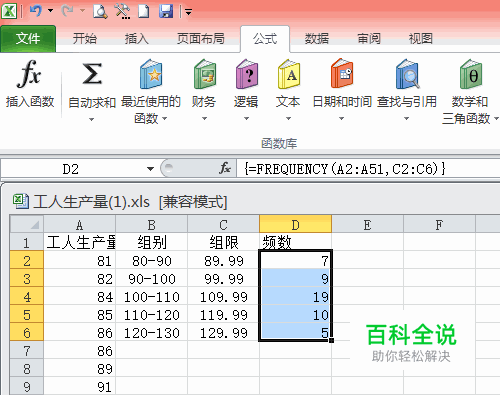 公式输入完成后,由于频数是数组操作,所以不能直接按enter键,而是同时按下Crtl+Shitft+enter,然后我们的结果就出来啦。我们的次数分布表就完成了