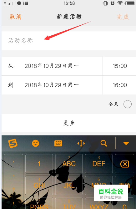 例如我的开会时间是下午四点半到五点半,就分别把开始时间跟结束时间设置好。如果是一整天的,例如生日,就点击右边的【全天】,然后点击【更多】。