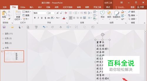 第一步,先插入文本,不采用先插入smartart图形是有原因的,先插入文本,在组织框架人数比较多的情况下,所花费的时间比较短(这里就随机举个例子来演示)。
