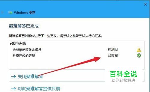 这时Windows10的疑难解答就会自动的修复系统,修复完成后会给出已修复的提示,点击关闭按钮后再次更新系统就可以了。