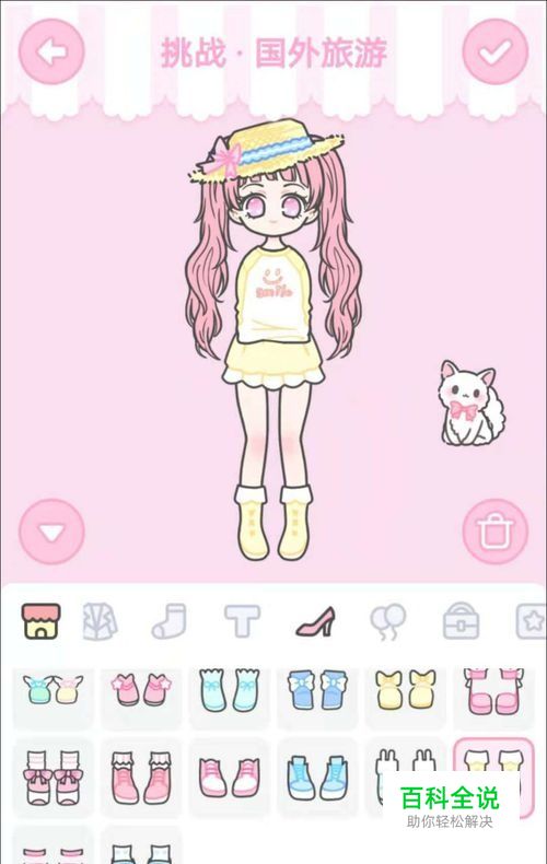 高帮休闲鞋 外出旅游,多会长时间步行,选择一双高帮休闲鞋(位置见下图),一方面方便行走,另一方面可以帮助保护脚踝位置,预防崴脚。 戴上防晒帽子,在穿上休闲衣服和鞋子就可以点击“√”出发旅行了,这样就可以挑战成功了