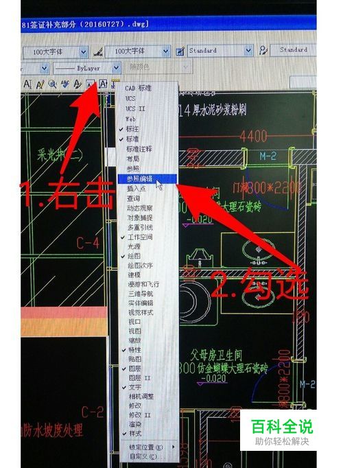 在命令行的命令按钮上用鼠标右键单击,出现下拉命令,勾选【参照编辑】,注意,在空白处右键单击是找不到参照编辑的。