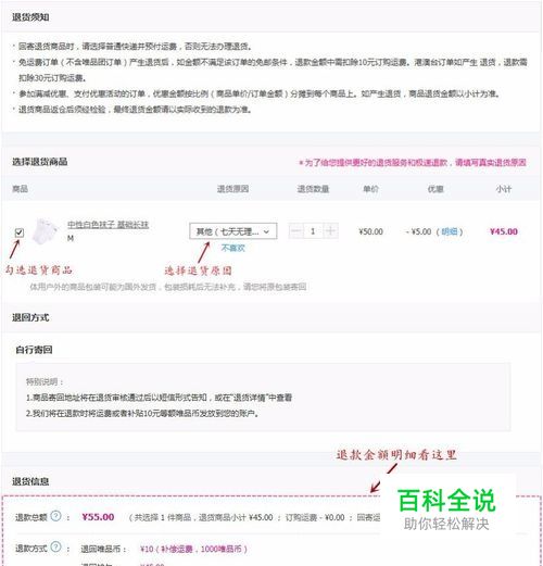 阅读退货政策,根据您的实际情况选择退货的原因,点击“提交退货申请”