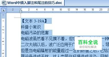 在编辑文章时,常常需要对一些从别的文章中引用的内容、名词或事件加注释。Word提供的插入脚注和尾注功能,可以在指定的文字处插入注释。脚注和尾注实现了这一功能唯一的区别是:脚注是放在每一页面的低端,而尾注是放在文档的结尾处。插入脚注和尾注的操作步骤如下: