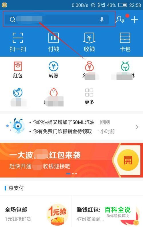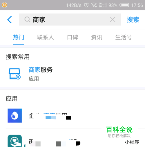 如图在支付宝首页上方搜索框中输入“商家服务”并点击。
