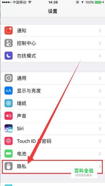来到我们手机的设置界面之后,在手机设置界面里往上滑,找到“隐私”选项。点击进入。