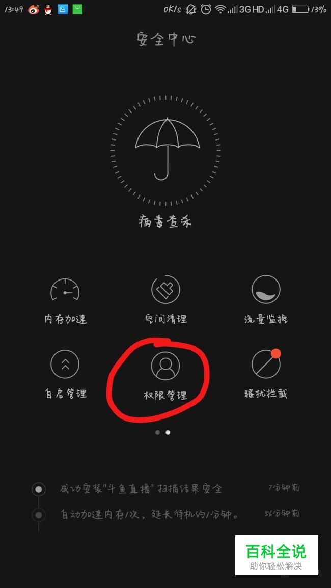 恩,今天我们以斗鱼直播为例吧,当我们录制完视频发现没有声音的时候,就点开手机的手机管家,然后找到权限管理