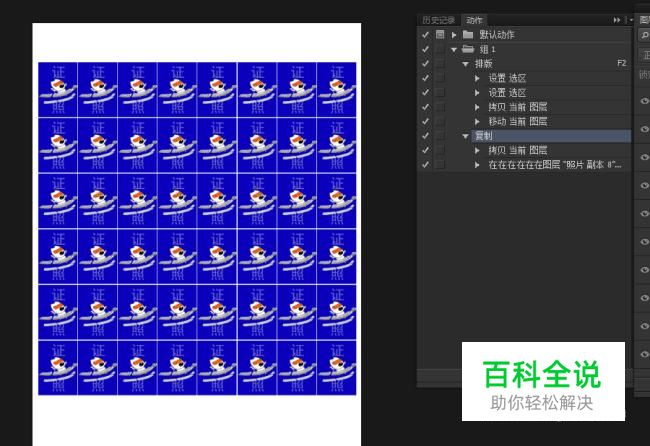 我们排好一排照片之后,需要再次录制一个新的复制动作。(先全选我们的第一排照片,再点击录制动作按钮按住Alt键将第一排照片向下拖拽再次复制一排。)