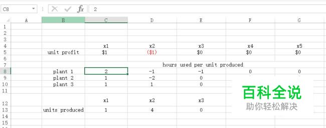 首先,我们根据题中信息列出excel表格,将其中约定条件下的系数写在“C8:G10”这个区域内,然后在“unit profit”后面列出目标函数的各项系数,其中,红色的数字表示负数,这个可以自行设置单元格的数字格式,在“units produced”后面列出变量xi,i=1,2,3,4,5。