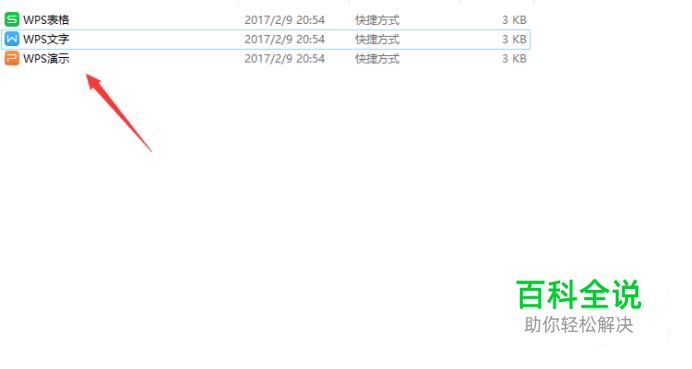 首先,我们打开WPS文件夹,可以看到有3中,分别为WPS表格、WPS文字、WPS演示,如图所示。