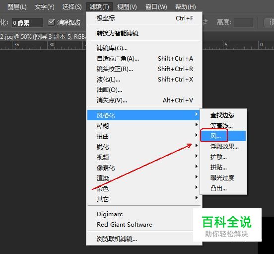 菜单栏:执行“滤镜”-“风格化”-“风”命令(2-3次),参数如下。
