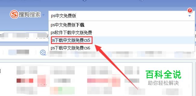 打开我们电脑的浏览器,在浏览器中输入“ps中文免费版”,我们在下拉中选择ps正文免费版ps5,如图所示。