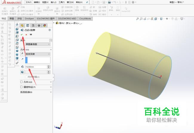 接下啦选择特征里的拉伸切除,这个命令就是以我们现在的画的圆为基准进行切除。