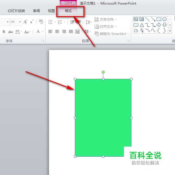 选中绿色的矩形图片,然后菜单栏就会出现“格式”菜单,鼠标点击格式菜单。