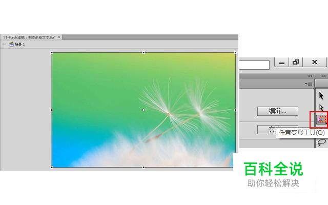 新建空白文档,并保存文件。执行【文件】/【导入】/【导入到舞台】命令。将素材导入舞台场景中,按照舞台尺寸选择【任意变形工具】并调整素材大小,如图所示。