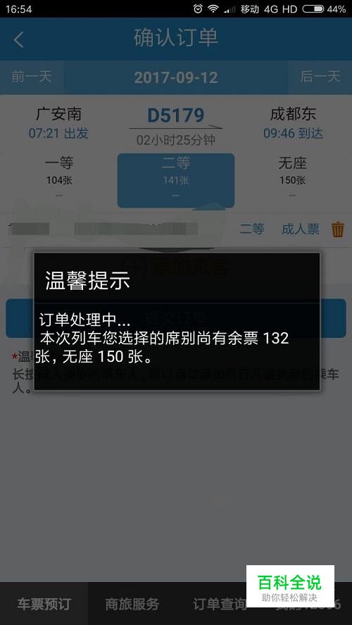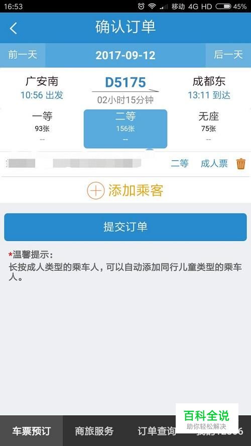 选择座位等级,一等二等或是无座,然后点击“提交订单”,如图所示。