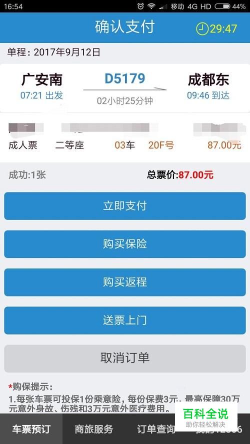确认班次,乘客信息无误后,点击“立即支付”,火车票就购买成功啦。